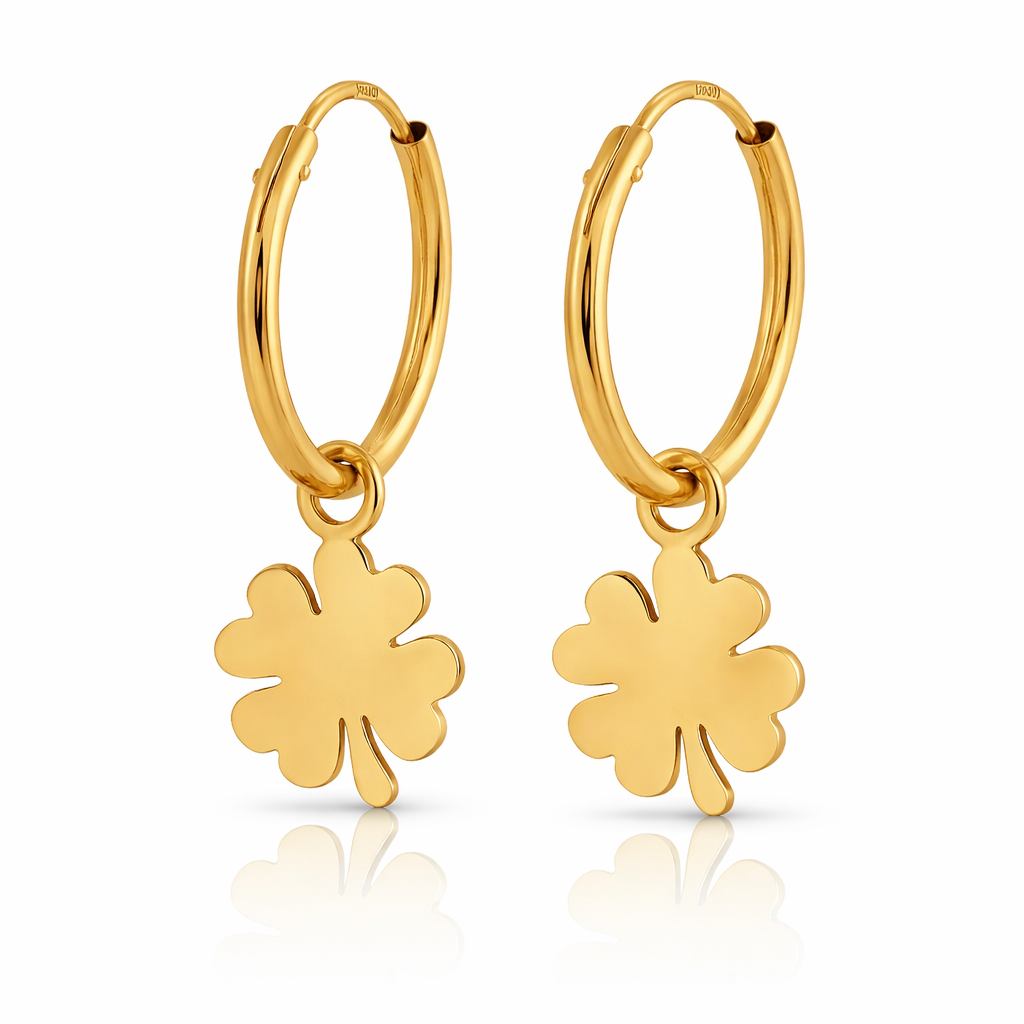 Elaboradas en oro italiano de 18 quilates, estas argollas de 12mm presentan un acabado liso y refinado que enmarca con sobriedad el protagonista real: el trébol de cuatro hojas colgante, trabajado con precisión artesanal italiana en oro puro. Cada hoja del trébol está finamente delineada, creando una pieza en miniatura de gran detalle que balancea con gracia con cada movimiento.