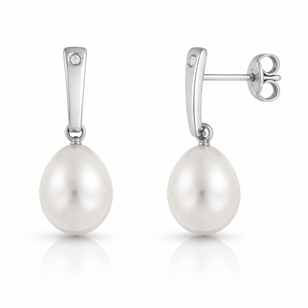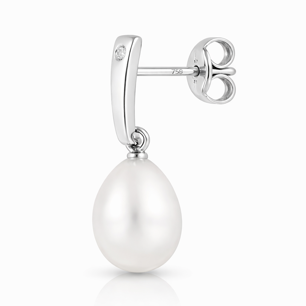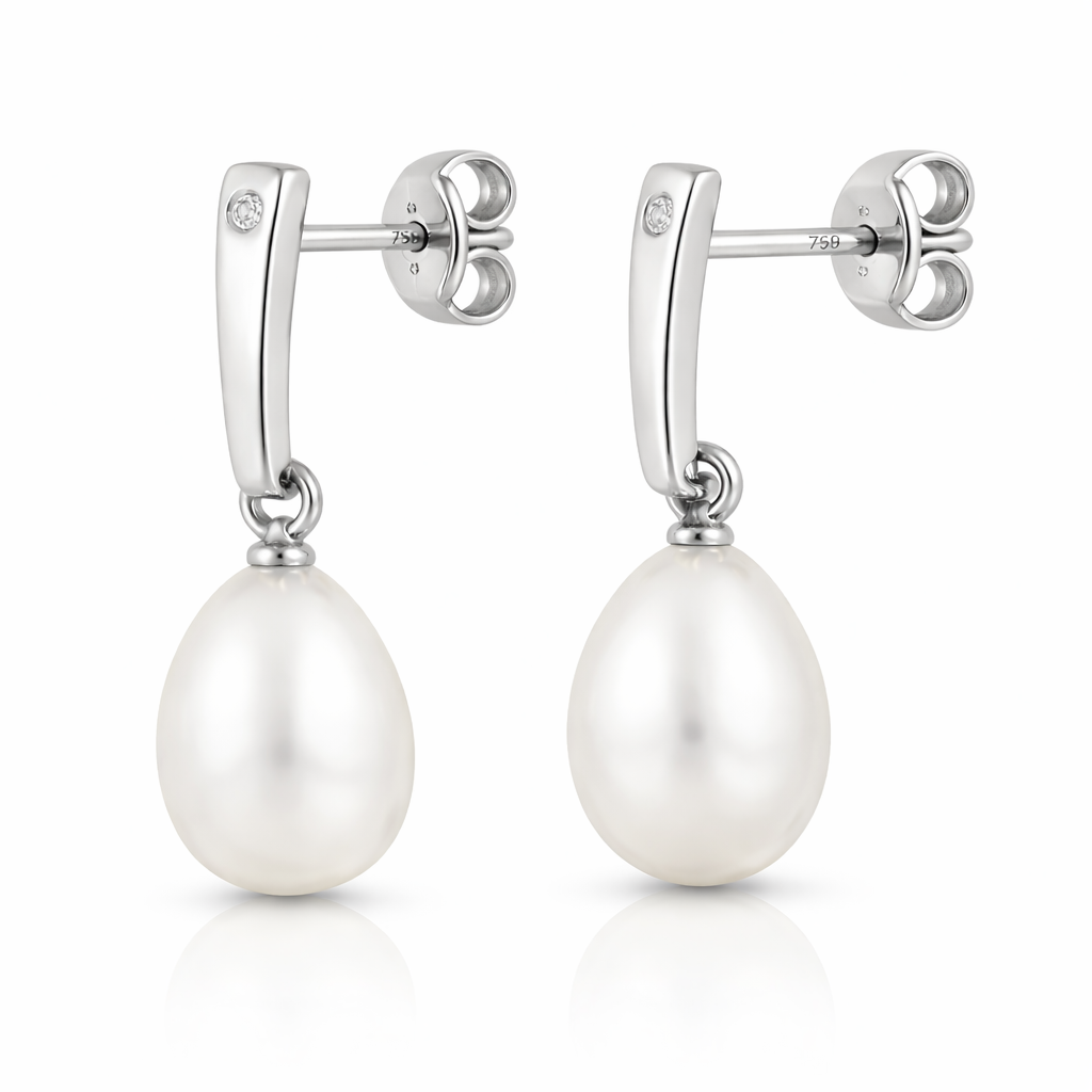 Elaborados en oro blanco italiano de 18 quilates, estos aros en banda de 1,6x6mm presentan un circón de brillantez cristalina que en la versión bianca alcanza su máxima luminosidad gracias al contraste con el metal blanco. El elemento más singular de la pieza es la perla botón natural de 6mm que cuelga como un fruto maduro del extremo inferior, uniendo en un solo arete la frialdad elegante del oro blanco con la calidez orgánica de la perla.