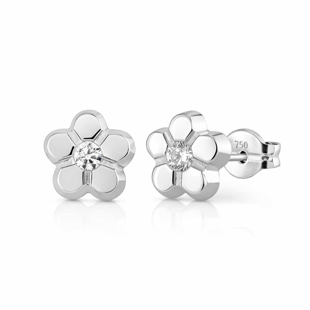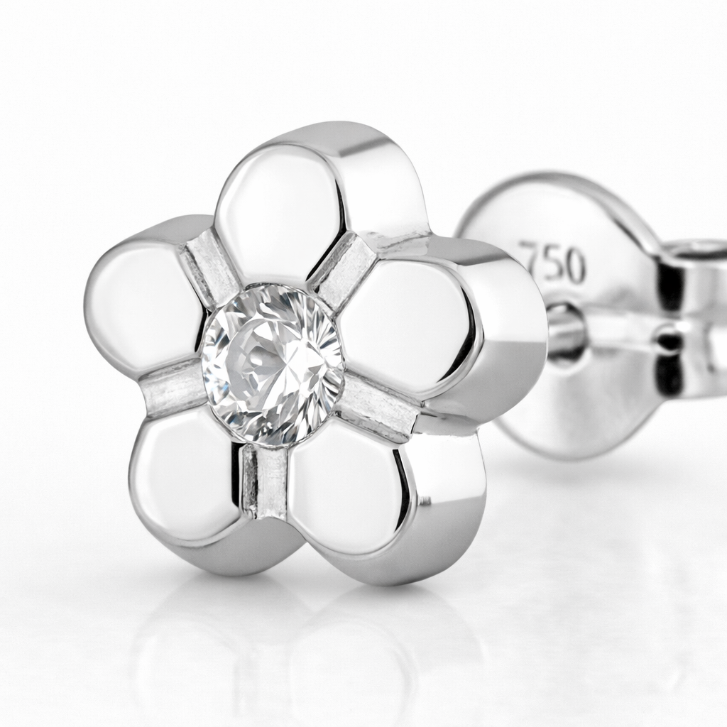 Elaborados en oro blanco italiano de 18 quilates, presentan una margarita de 5 pétalos meticulosamente trabajados en oro blanco, con un fino circón italiano de gran luminosidad que actúa como el corazón brillante de la flor. El diseño colgante añade movimiento a la composición, haciendo que la margarita de oro baile suavemente con cada paso de quien la lleva.