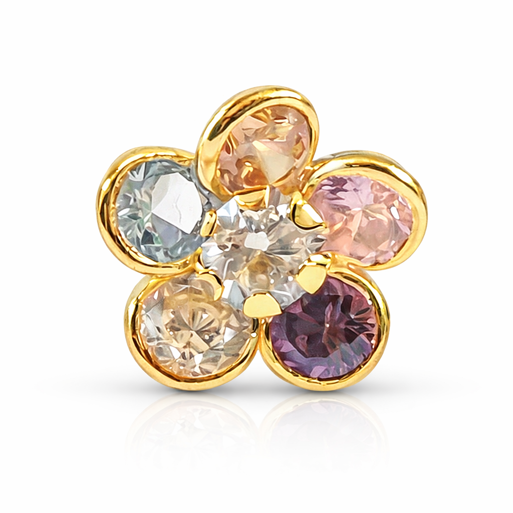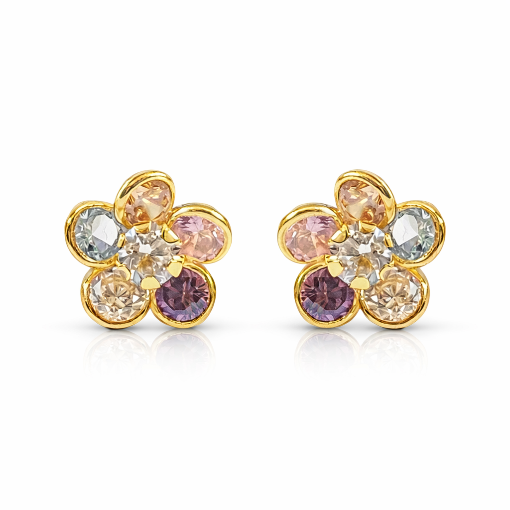 Elaborados en oro italiano de 18 quilates, su estructura floral de 7x7mm presenta en el centro un circón de brillantez pura que actúa como el núcleo luminoso de la composición. Alrededor de ese centro, los pétalos se adornan con piedras de colores cuidadosamente seleccionadas por su armonía cromática, creando una paleta de colores que evoca los estandartes del Palio de Siena.