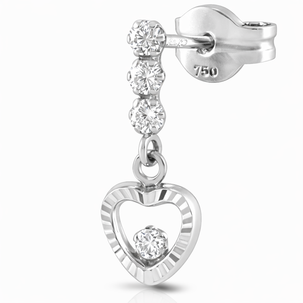 Elaborados en oro blanco italiano de 18 quilates, presentan una cadena delicada que desciende con gracia natural ornamentada con tres circones dispuestos en perfecta progresión, creando un recorrido de luz que culmina en un colgante en forma de corazón engarzado con un circón central. El corazón, símbolo universal del amor, brilla en el extremo de estos aros como una promesa de vida compartida.