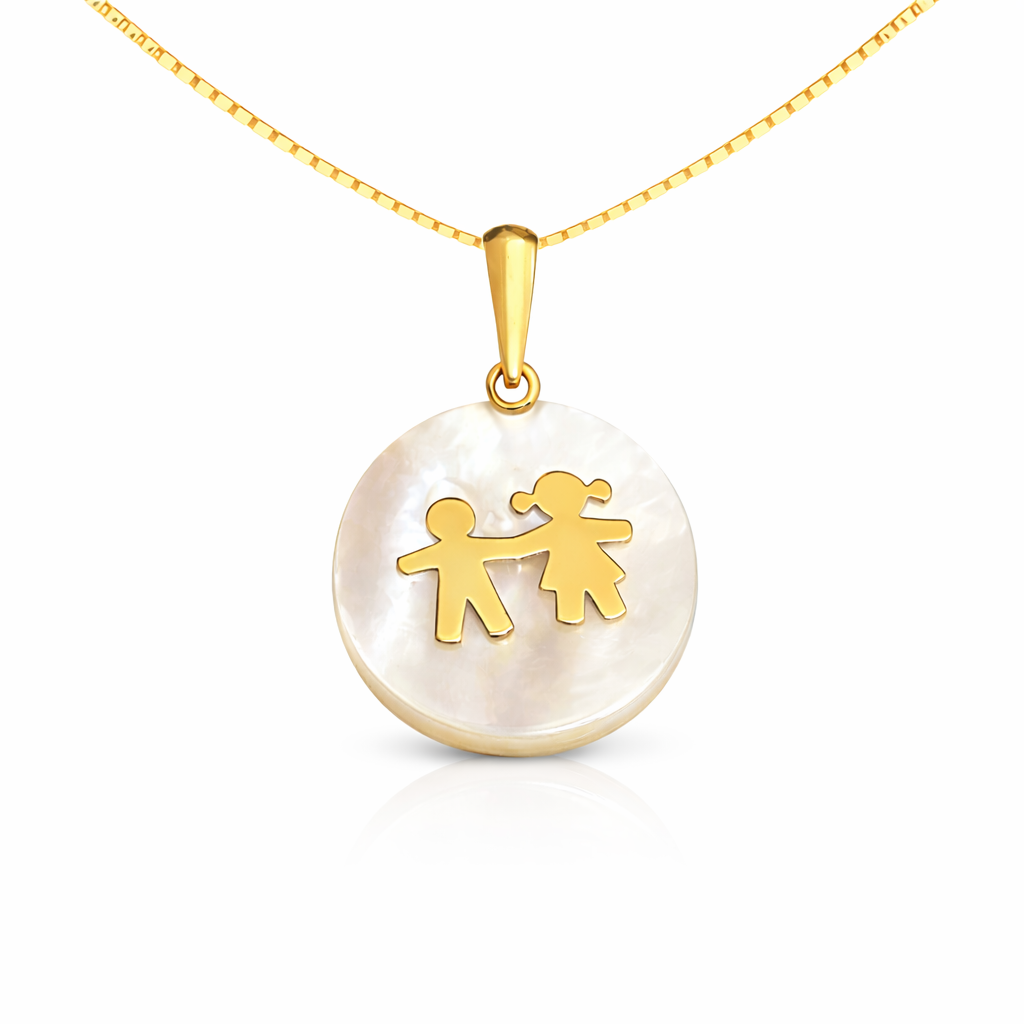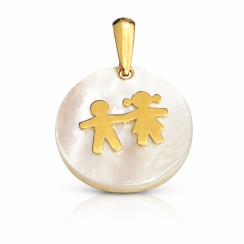 El colgante presenta una base de nácar natural, con sus característicos reflejos iridiscentes, sobre la que se alzan figuras de niños fundidas en oro italiano de 18 quilates. La combinación del nácar blanco y luminoso con el oro amarillo de las figuras crea un contraste visual de gran belleza y un simbolismo poderoso: el calor del oro que abraza la pureza del nácar, como el amor materno que abraza la inocencia de los hijos.