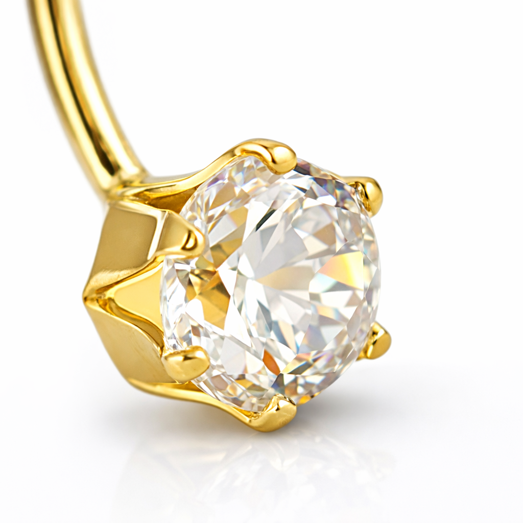 Elegante piercing de ombligo en oro italiano de 18 quilates con diseño de garra que sostiene firmemente un brillante circón italiano de 7mm, de luminosidad excepcional.