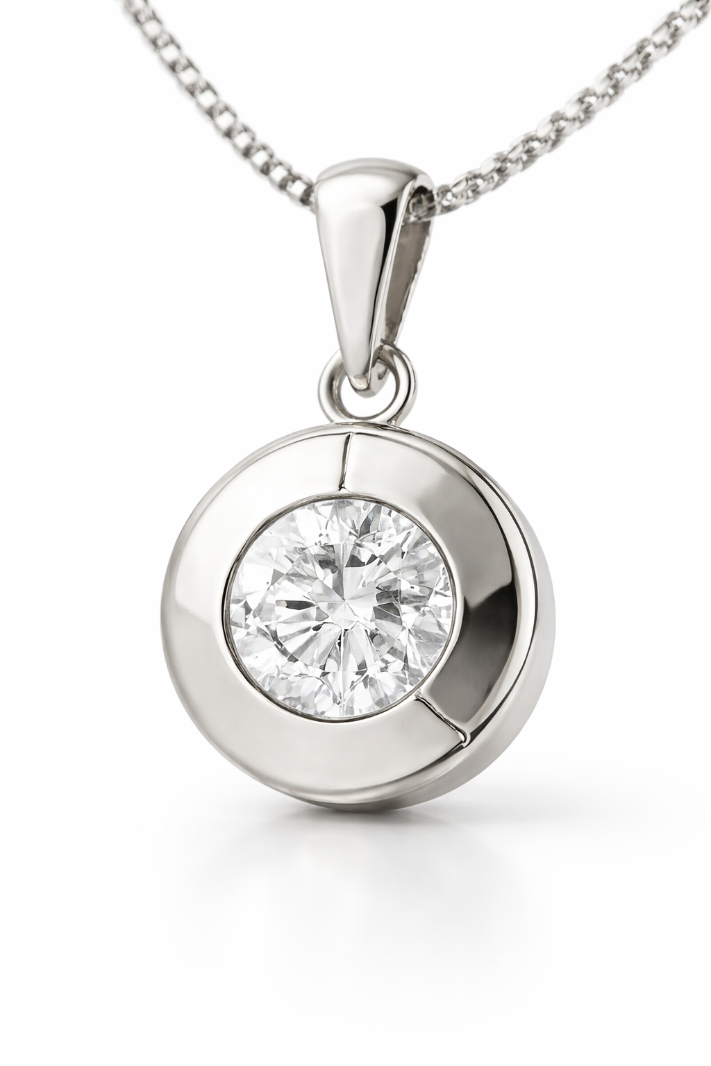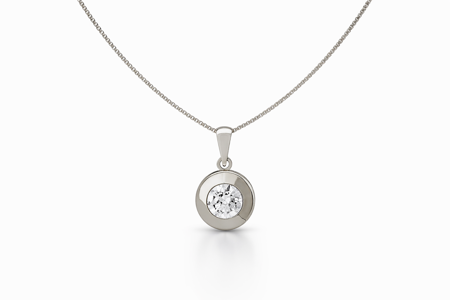 Su punto de luz central incorpora un circón brillante engastado en bisel, un tipo de montura que protege la piedra y permite una reflexión uniforme de la luz, logrando un destello delicado y elegante. El contraste entre el brillo del circón y la pureza del oro blanco crea una pieza armónica, equilibrada y atemporal.